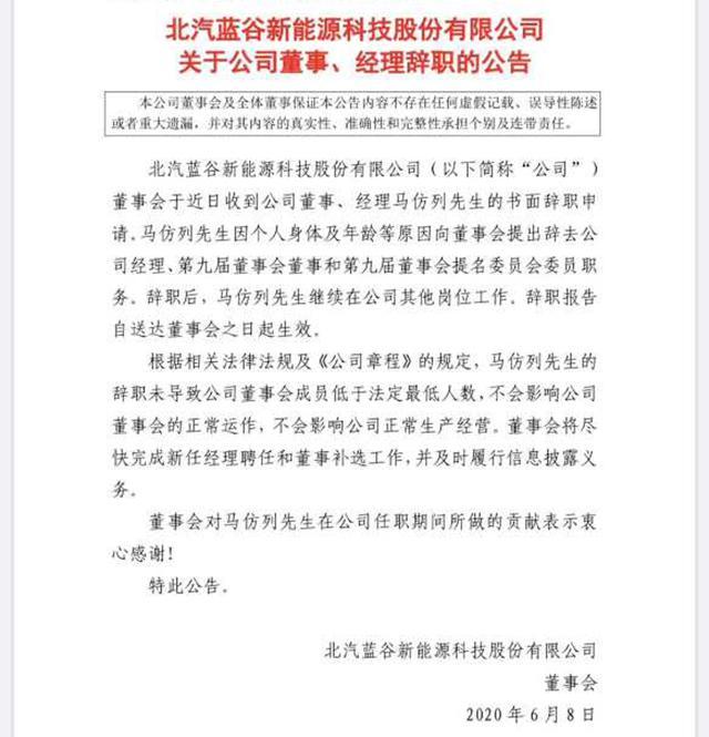 “马仿列加入北汽新能源事业6年来,无论身居何处,始终以身作则,高度服从组织安排,识大体、顾大局,主动担当、工作勤恳、为人正直、细致踏实、兢兢业业,为北汽的新能源事业做出了卓越贡献。”对马仿列任职期间所做出的努力、取得的业绩和无私的付出,北汽蓝谷董事会做出的评价,正是他过去多年工作的一个缩影。 文/《汽车人》管宏业 6月8日,北汽蓝谷新能源科技股份有限公司发布公告称,由于个人身体及年龄等原因,马仿列已向北汽蓝谷董事会提出辞去董事、经理的申请,且不再担任北汽新能源党委副书记、总经理职务,并获得批准。
